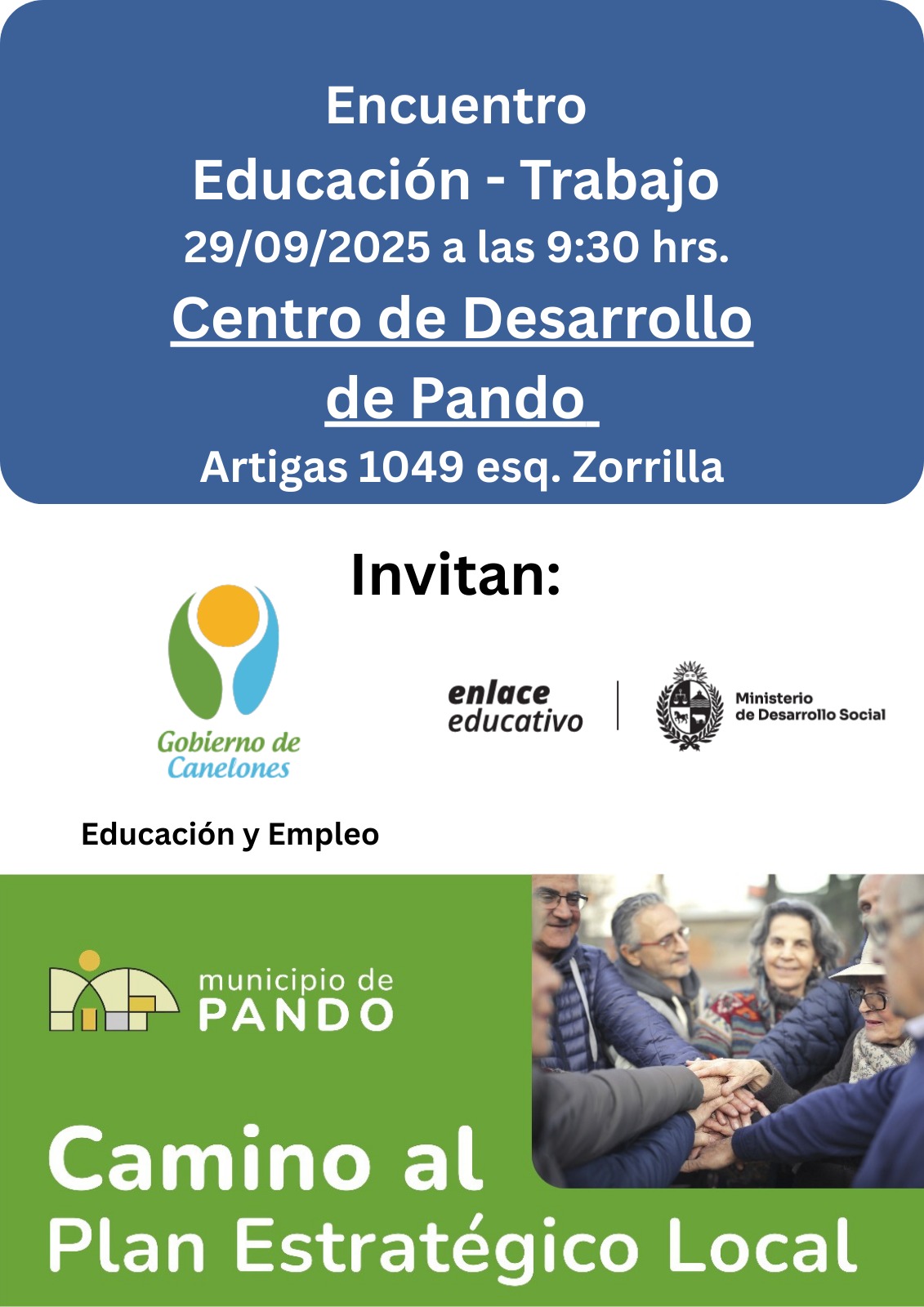 Participamos del Encuentro “Educación – Trabajo”,  en el Centro de Desarrollo de Pando, actividad organizada por el Gobierno de Canelones, el Ministerio de Desarrollo Social y el Municipio de Pando, en el marco del proceso de elaboración del Plan Estratégico Local. El encuentro tuvo como objetivo generar un espacio de diálogo y articulación entre el sistema educativo y el mundo del trabajo, fortaleciendo las oportunidades de formación y empleo en el territorio.